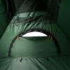 У палатки большой вход, что позволяет при необходимости вносить в него различное оборудование длякухни. Полог входа имеет два замка сверху и снизу молнии, в случае необходимости можно делать второе отверстие для вентиляции палатки, используя верхний замок молнии. Напротив входа в стенке палатки есть полукруглое вентиляционное окно. Это окно существует не только для вентиляции: если вы оборудуете летний душ, то емкость с водой можно разместить на ближайшем дереве или столбе, врытом в землю, так как обычно эта емкость достаточно много весит, а шланг с лейкой пропустить через указанное окно. И окно, и полог входа имеют специальный клапан, закрывающий молнию от проникновения воды в палатку. Кроме того, в верхней части купола палатки вшита сетка для дополнительной вентиляции. Сетка закрыта специальным колпаком, защищающим от дождя.