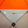 - При креплении укрытия на льду распределять растяжки симметрично по всему периметру, что поможет избежать перекоса и чрезмерной нагрузки на молнию входной двери